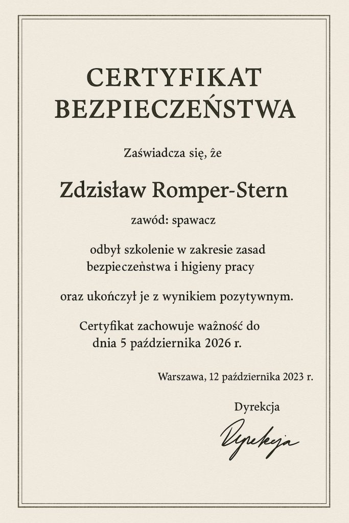 Za każdą dobrze wykonaną pracą stoją wiedza, doświadczenie i odpowiednie kwalifikacje. Poniżej znajdziesz dyplomy, certyfikaty oraz zaświadczenia, które potwierdzają moje przygotowanie zawodowe i ciągły rozwój w dziedzinie spawalnictwa.