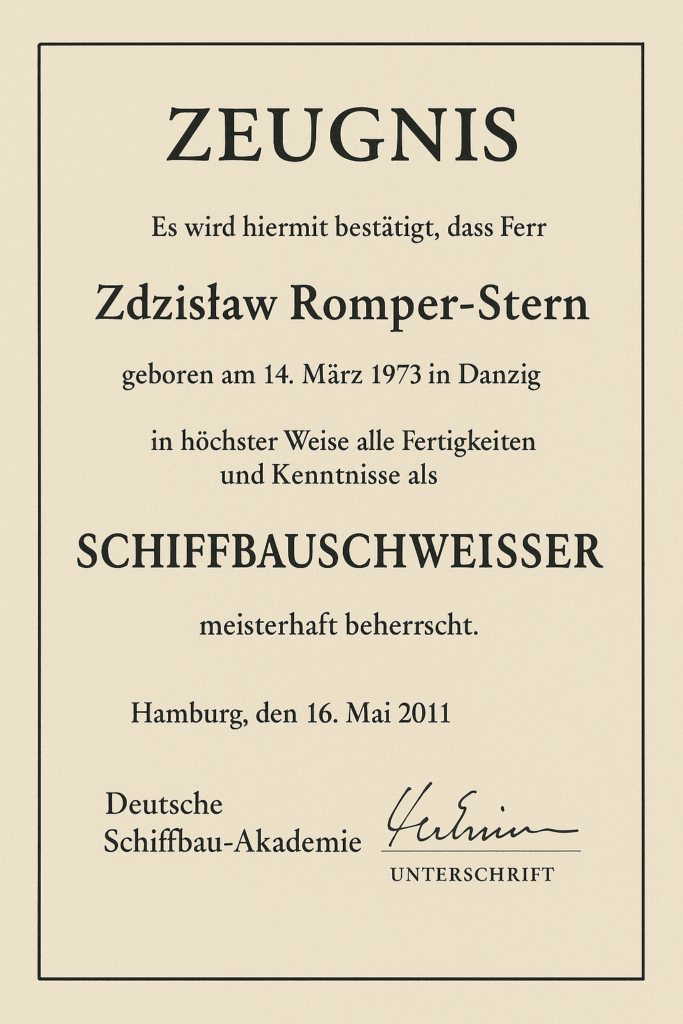 Niemiecki dyplom ukończenia kursu spawania statków: